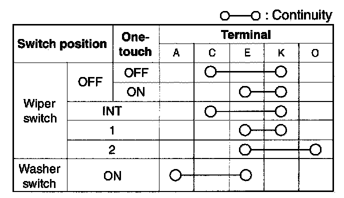 2. Inspect for continuity between the wiper and washer switch terminals using an ohmmeter.