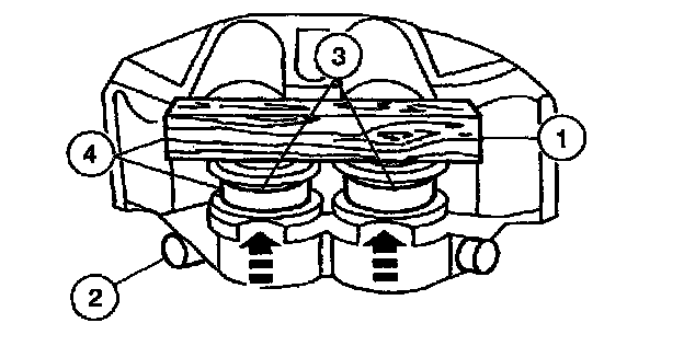 1. Place a block of wood between the caliper bridge and the caliper pistons.