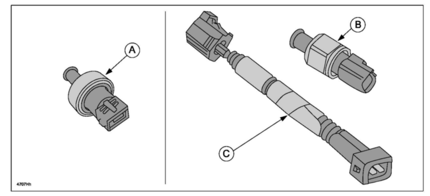 Note that the revised CCDS (B) has a different electrical connector. An adapter jumper harness (C) (which is included in the parts kit) is required when replacing the old CCDS with the revised CCDS.