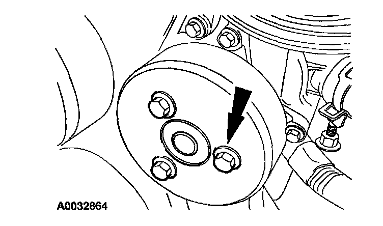 ^ There is one bolt behind the cooling fan drive pulley. This bolt can be accessed by lining up one of the holes in the pulley with the bolt.