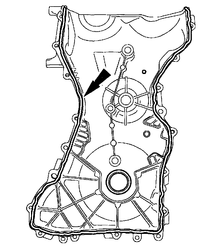 3. Apply a 2.5 mm bead of silicone gasket and sealant to the cylinder head and oil pan joint areas. Apply a 2.5 mm bead of silicone gasket and sealant to the front cover.