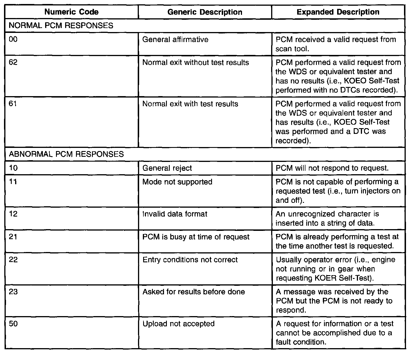 It is possible to receive a communication error from a WDS or equivalent tester when initiating a diagnostic test or accessing PIDs. The communication error can be caused by operator error, the vehicle wiring, connectors, the PCM or other control modules connected to the DLC wiring. The PCM will respond to a WDS or equivalent tester whenever the tool requests a test. These are not DTCs. Listed are numeric codes and generic descriptions that a scan tool may display when trying to perform some PCM operations. It is possible to get other numeric codes not listed. For a complete list of communication response codes, Refer to Society of Automotive Engineers (SAE) document J2190 enhanced E/E Diagnostic Test Modes. Some are normal responses to valid requests. The others are communication error responses. If the tool displays any of the communication error responses check scan tool connections, cable/adapters and entry of vehicle information.
