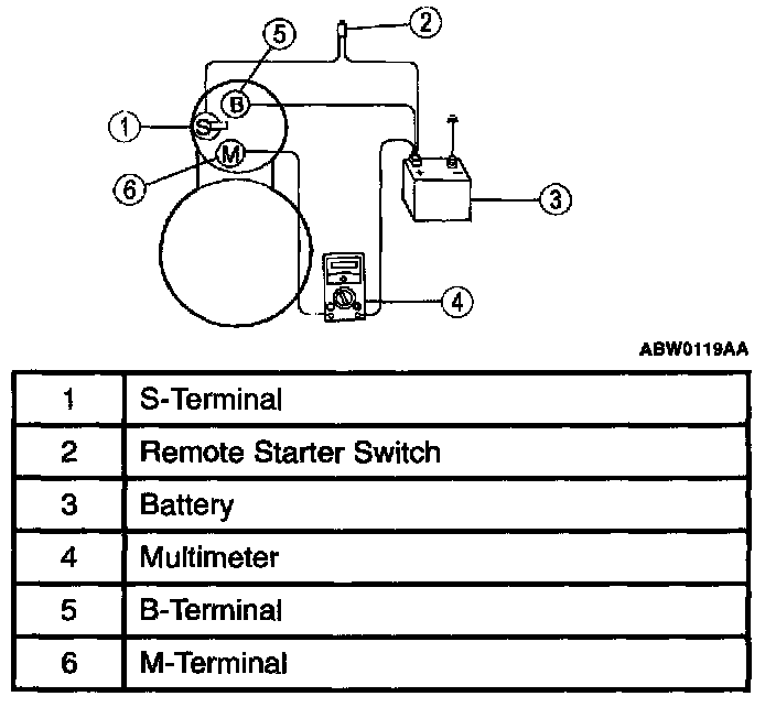 8. Remove the cables from solenoid B-, S- and M-terminals. Clean the cables and connections and reinstall the cables to the proper terminals. Repeat Steps 3 through 6. If the voltage drop reading is still greater than 0.5 volts when checked at the M-terminal or less than 0.5 volts when checked at the B-terminal, the concern is in the solenoid contacts. Replace the starter motor.