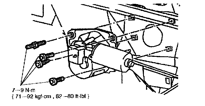 7. Remove the stud bolt and three bolts from the wiper motor.