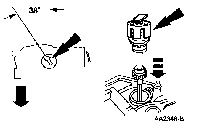 2. Install the camshaft synchronizer housing assembly so the arrow on the special tool is 38 degrees from the centerline of the engine.