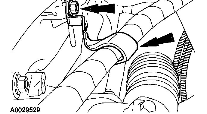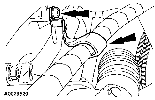 5. On A/C equipped vehicles, install the A/C line bracket and bolt.