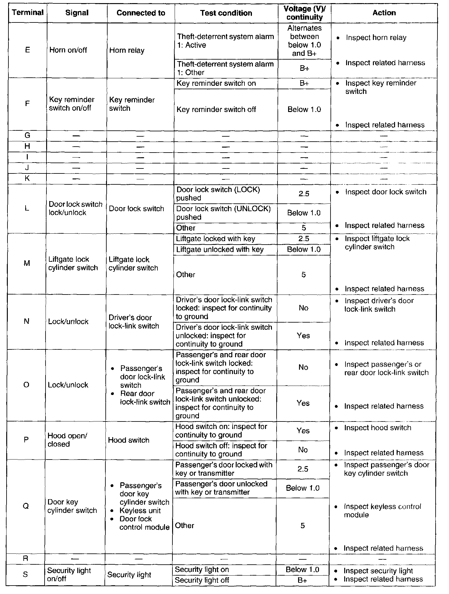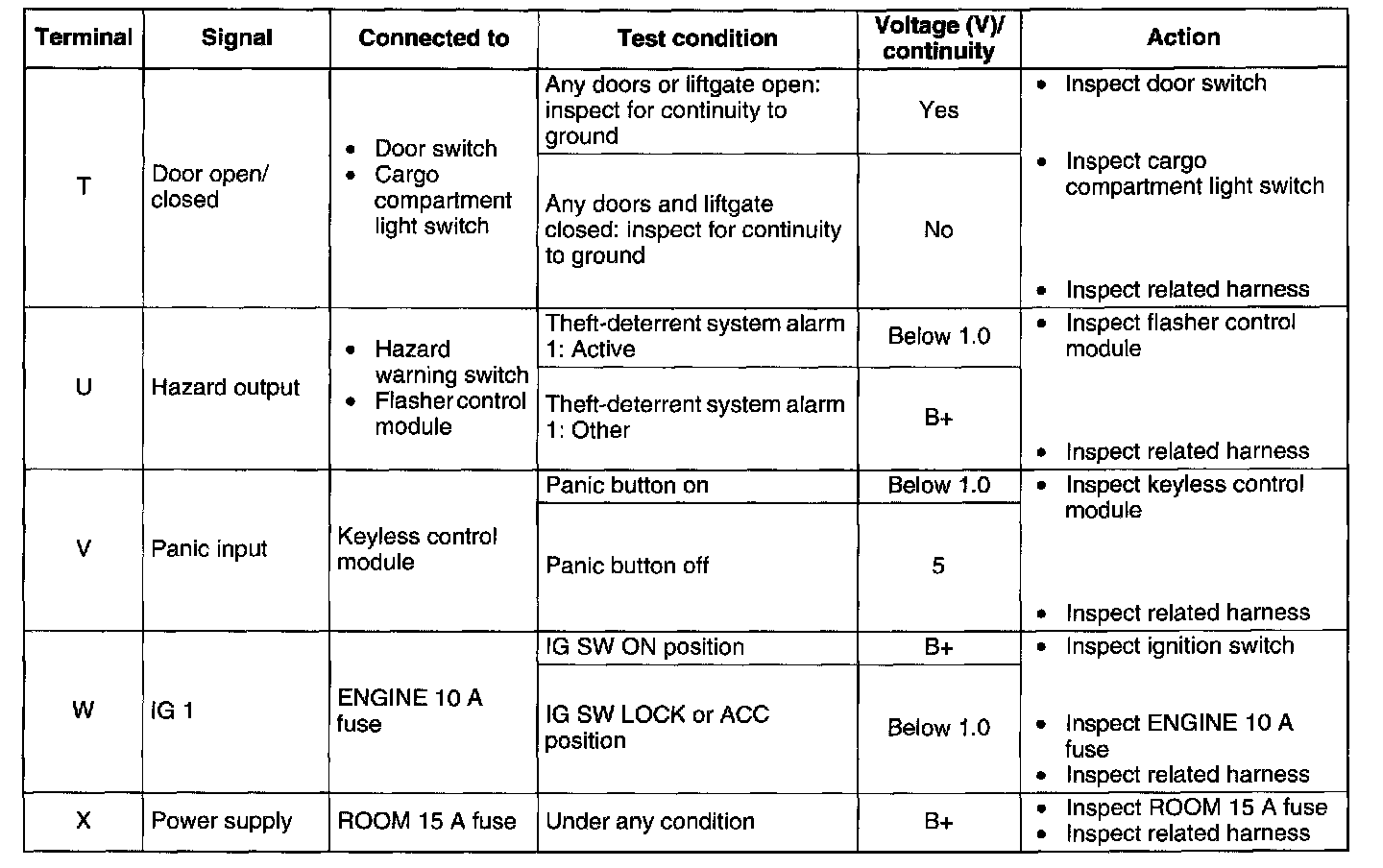 3. Disconnect the theft-deterrent control module connector before inspecting for continuity at terminals B, N, O, P, and T.
