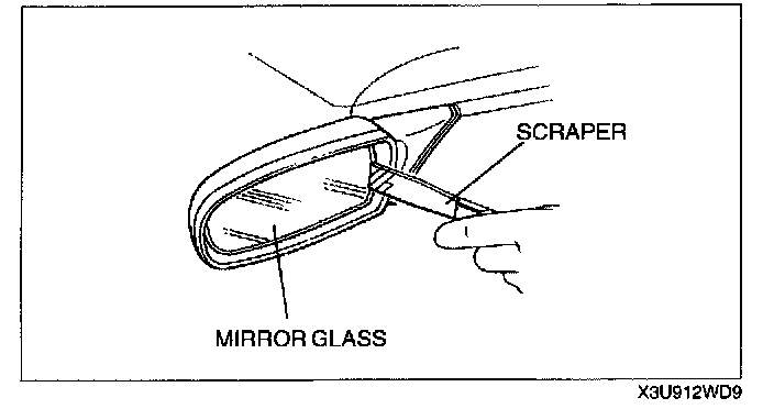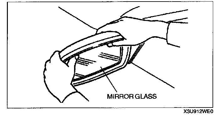 OUTSIDE MIRROR GLASS REMOVAL1. Warm the frame and the mirror glass to approximately 70 °C {158 °F} for 3 minutes using a hot air blower.