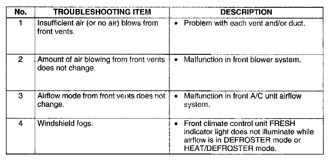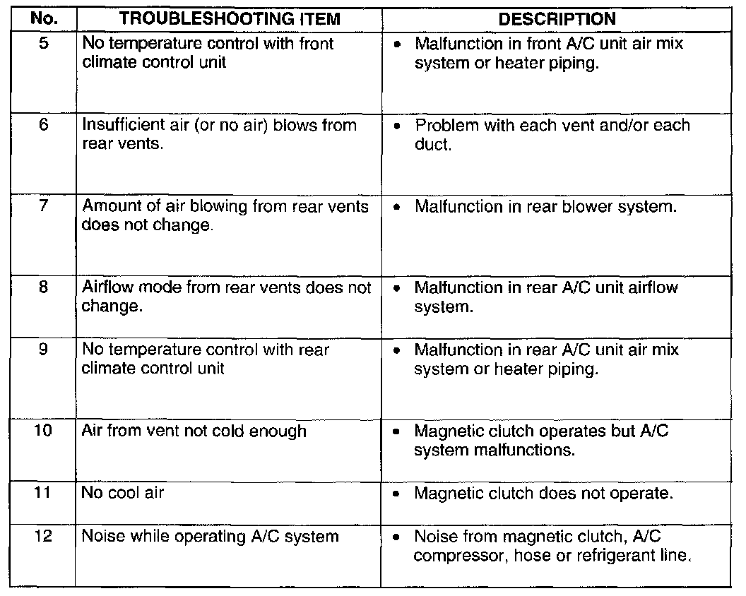 - The areas for inspection (steps) are given according to various circuit malfunctions. Use the chart below to verify the symptoms of the trouble in order to diagnose the appropriate area.