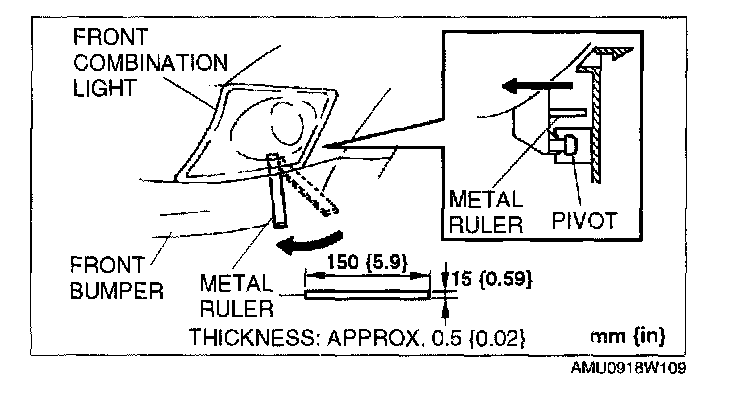 1. Insert a 15 mm {0.59 in} maximum width metal ruler into the end of the front combination light approximately 75 - 80 mm {3.0 - 3.1 in}. Rotate the metal ruler towards the front of the vehicle and remove the front combination light.