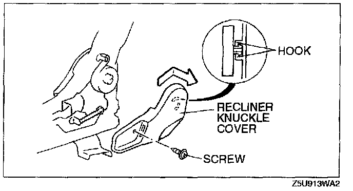2. Lift the reclining knuckle cover in the arrow direction to remove the hook.
