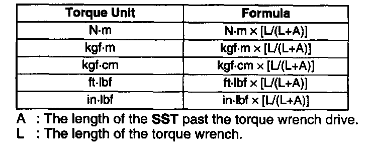 ^ When using a torque wrench-SST or equivalent combination, the written torque must be recalculated due to the extra length that the SST or equivalent adds to the torque wrench. Recalculate the torque using the following formulas. Choose the formula that applies to you.