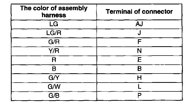 1. Make sure the terminals of the harness assembly are connected to the terminals of the connector as shown in the table.