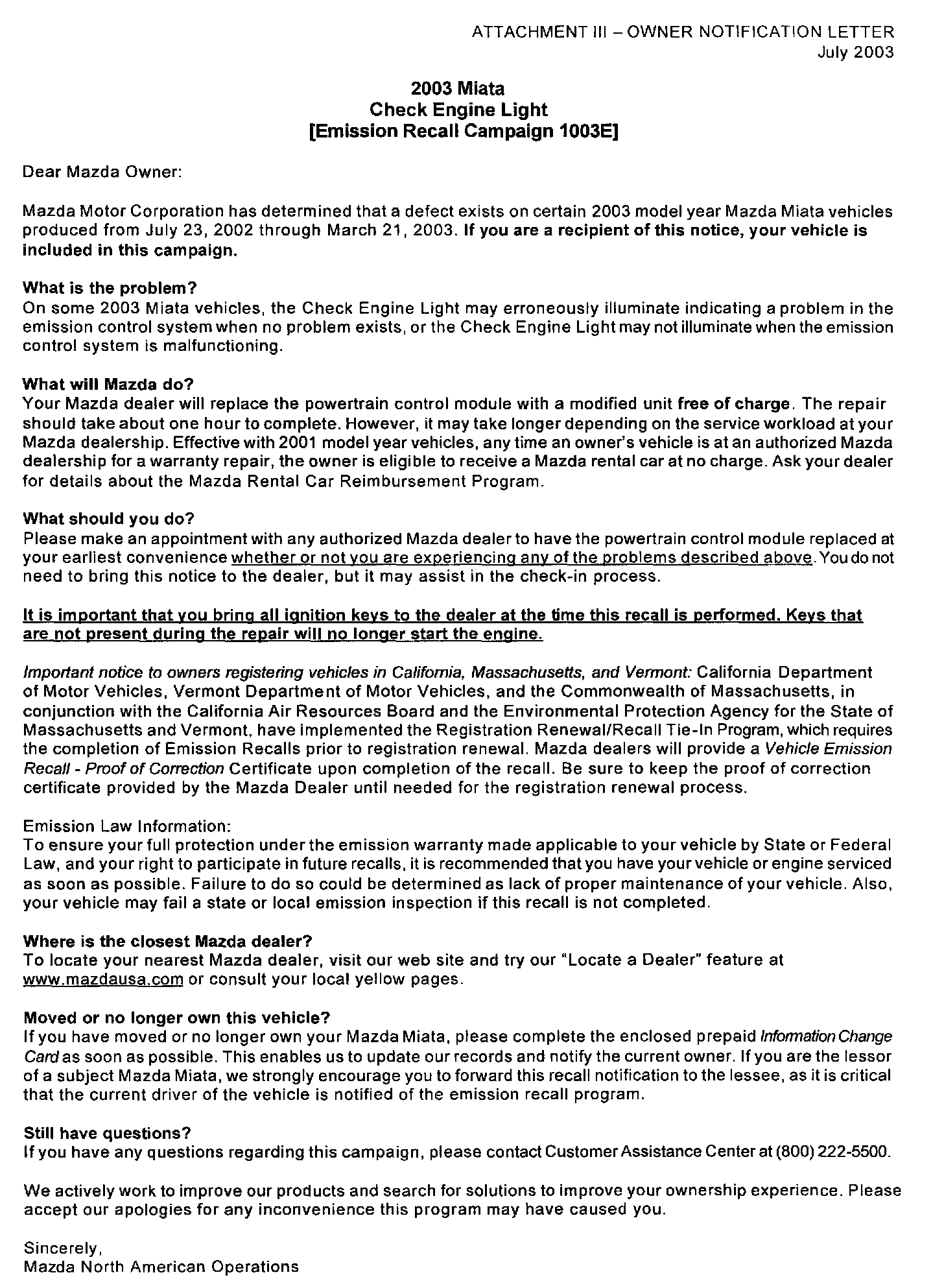 Attachment III - Owner Letter