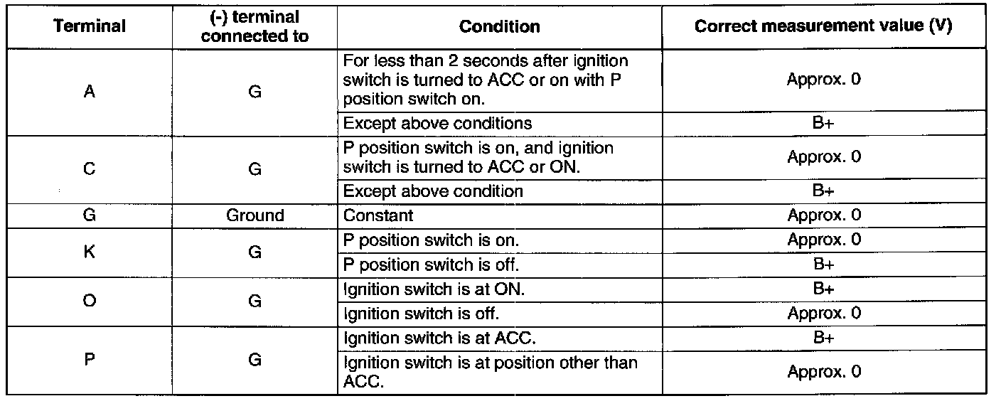 2. Turn the ignition switch to ON, and inspect terminal voltages, referring to the chart below.