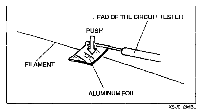 CAUTION: Directly touching the rear window defroster filament with the lead of the circuit tester will damage it. Wrap aluminum foil around the end of the lead and test the filament by touching it with the foil.