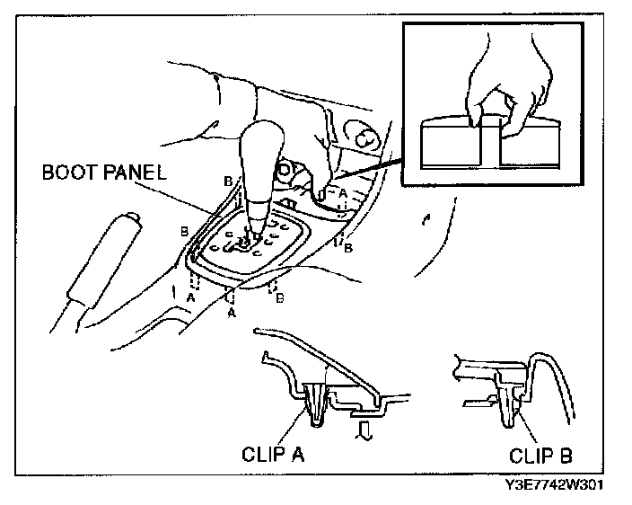 1. Pull the boot panel upward, then disengage clips A and B from the console.