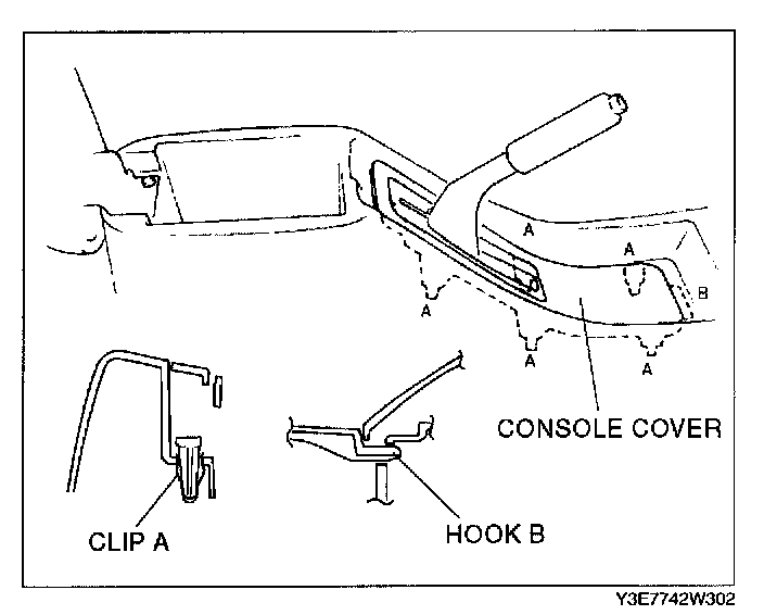 2. Pull the console cover upward, then disengage hook B from the console.