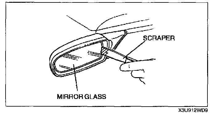 OUTSIDE MIRROR GLASS REMOVAL1. Warm the frame and the mirror glass to approximately 70 °C {158 °F} for 3 minutes using a hot air blower.