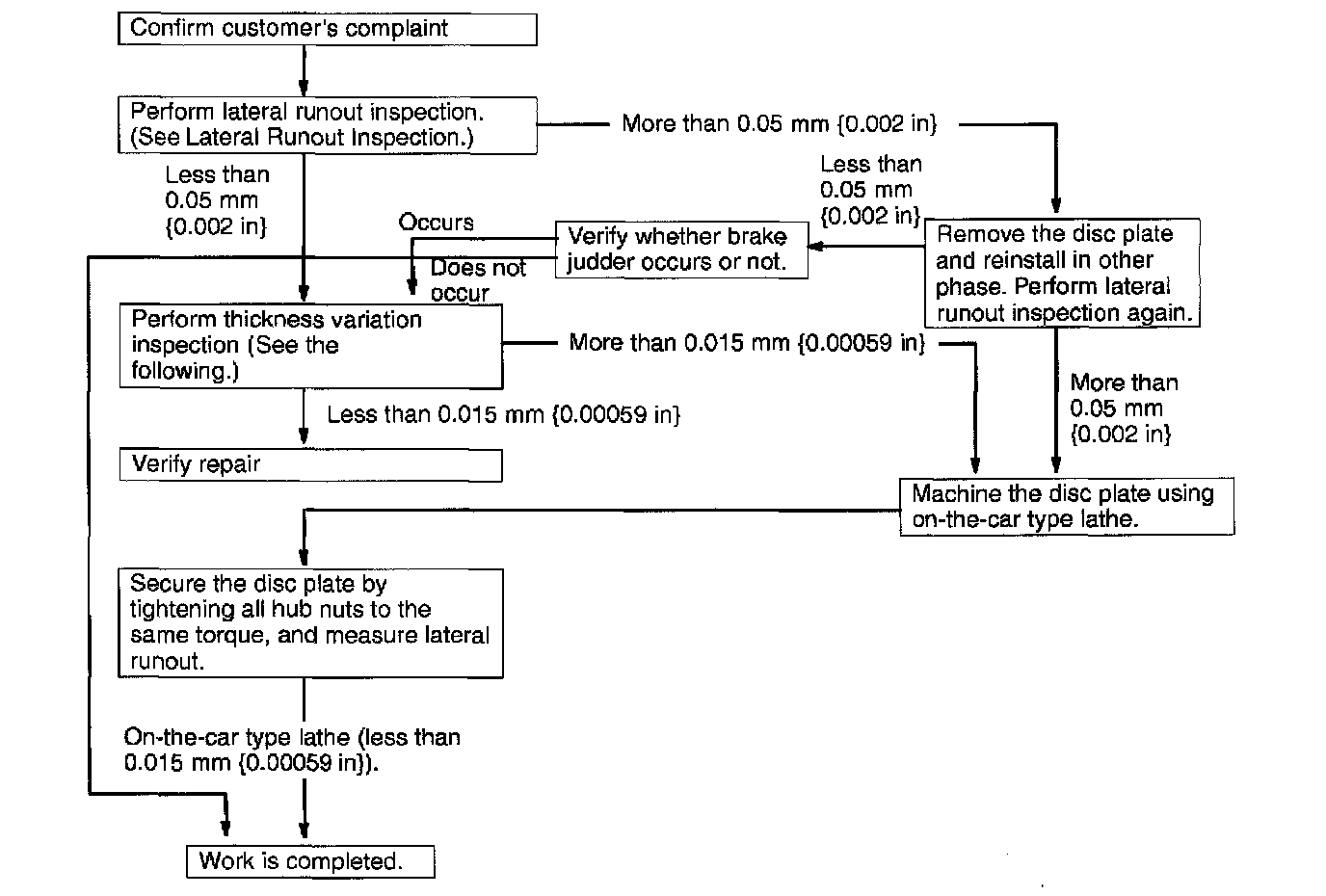 1. If the runout is more than 0.05 mm (0.002 inch) 10 mm (0.39 inch) from the disc plate edge, an uneven wear occurs on the disc plate because the pad contacts the plate unevenly.