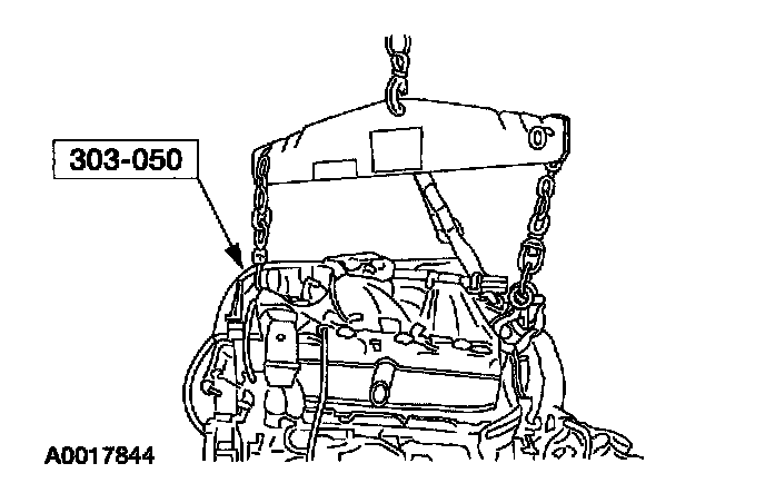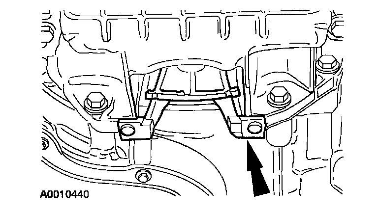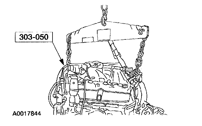 ^ Do not allow the engine oil pan to rest on the powertrain lift.