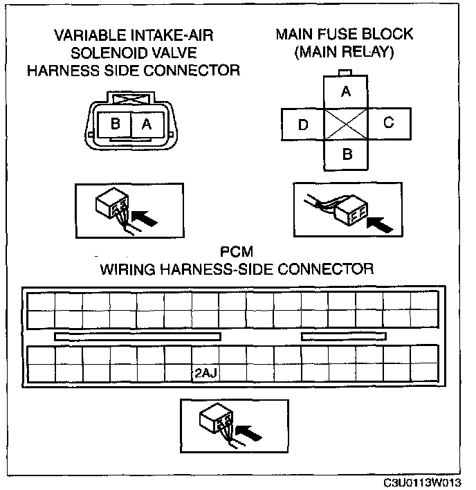 - Variable intake-air solenoid valve terminal A and PCM terminal 2AJ