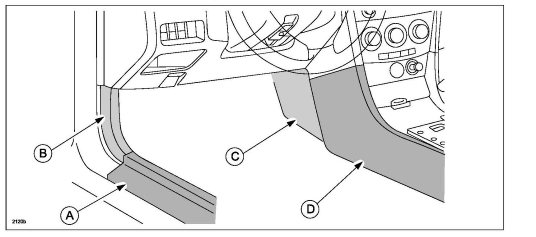 3. Remove the scuff plate (A), the front side trim (B), and the side wall (C), then remove the rear console (D). Refer to MS3 online instructions or Workshop Manual section 09-17 INTERIOR TRIM LOCATION INDEX.