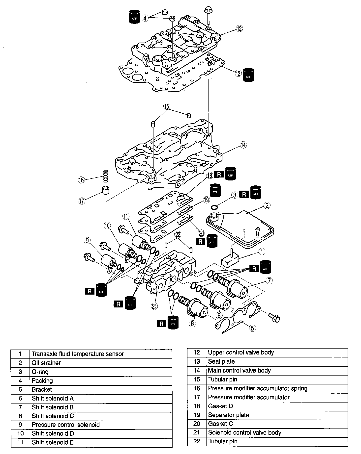 10. Install the shift solenoid D, E, and pressure control solenoid.