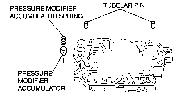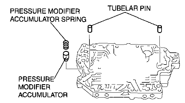 11. Remove the tubular pins, pressure modifier accumulator spring and pressure modifier accumulator from the main control valve body.
