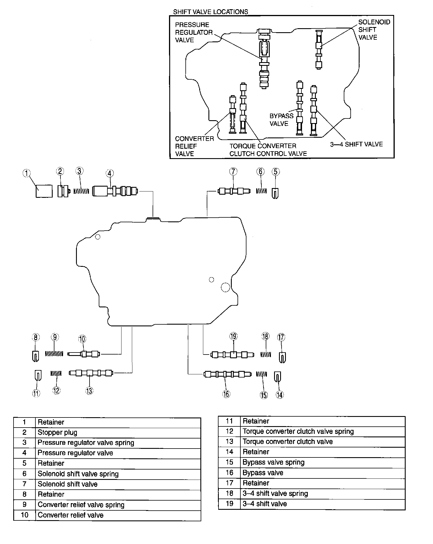 2. Install the 3-4 shift valve, 3-4 shift valve spring, and retainer.