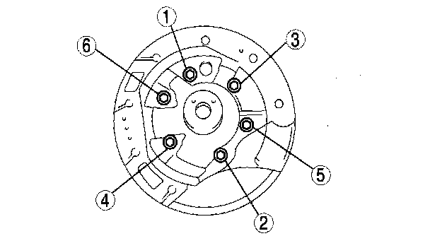^ Loosen the mounting bolts evenly in the pattern shown and remove the oil pump cover from the oil pump housing.
