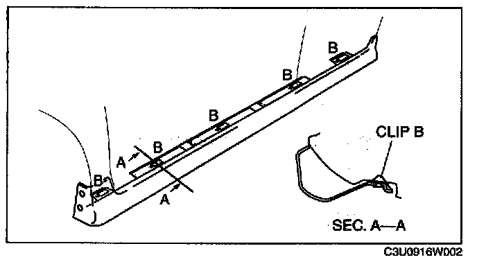 4. Slide the side step molding towards the front of the vehicle and remove clips B from the side step molding.