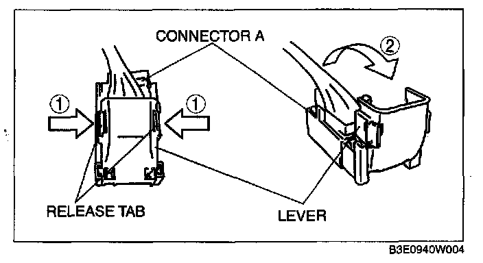 1. Rotate the lever in the direction of the arrow and remove connector B.