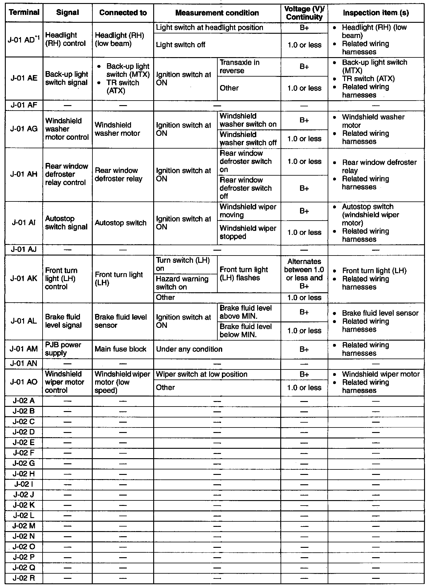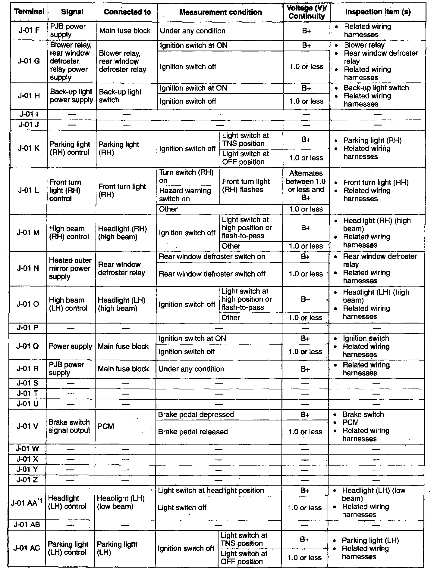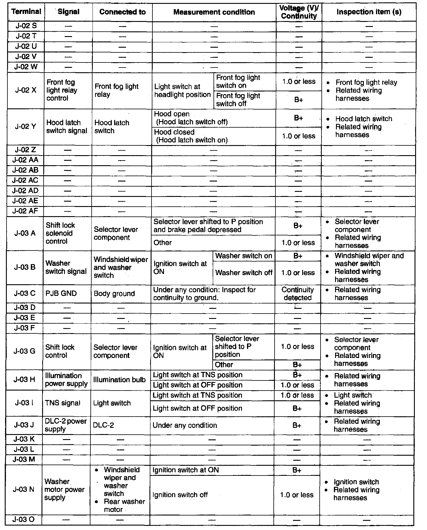 - If the voltage or continuity is not as specified in the Terminal Voltage Table (Reference), inspect the parts under "Inspection item (s)".