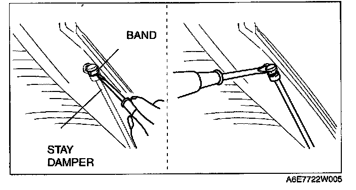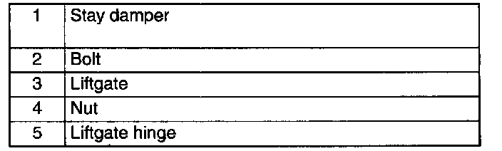 LIFTGATE REMOVAL/INSTALLATIONWARNING: Removing the stay damper without supporting the liftgate can be dangerous. The liftgate may fall and injure you. Always perform the following procedure with at least another person.