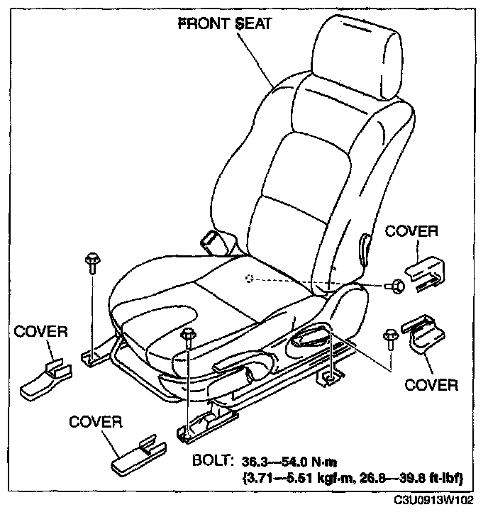 FRONT SEAT REMOVAL/INSTALLATIONWARNING: Handling the front seat (side air bag) improperly can accidently deploy the side air bag, which may seriously Injure you. Read AIR BAG SYSTEM SERVICE WARNING before handling the front seat.