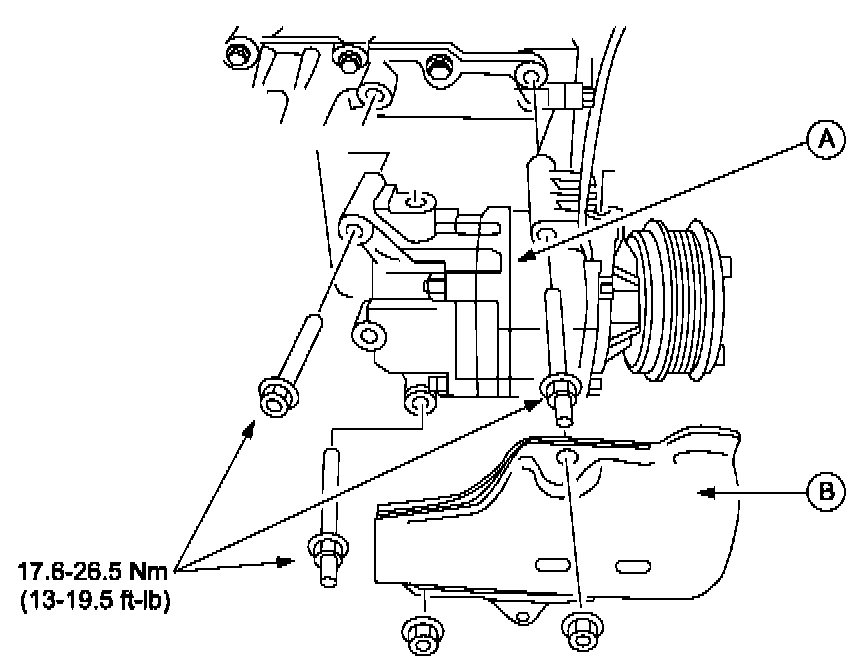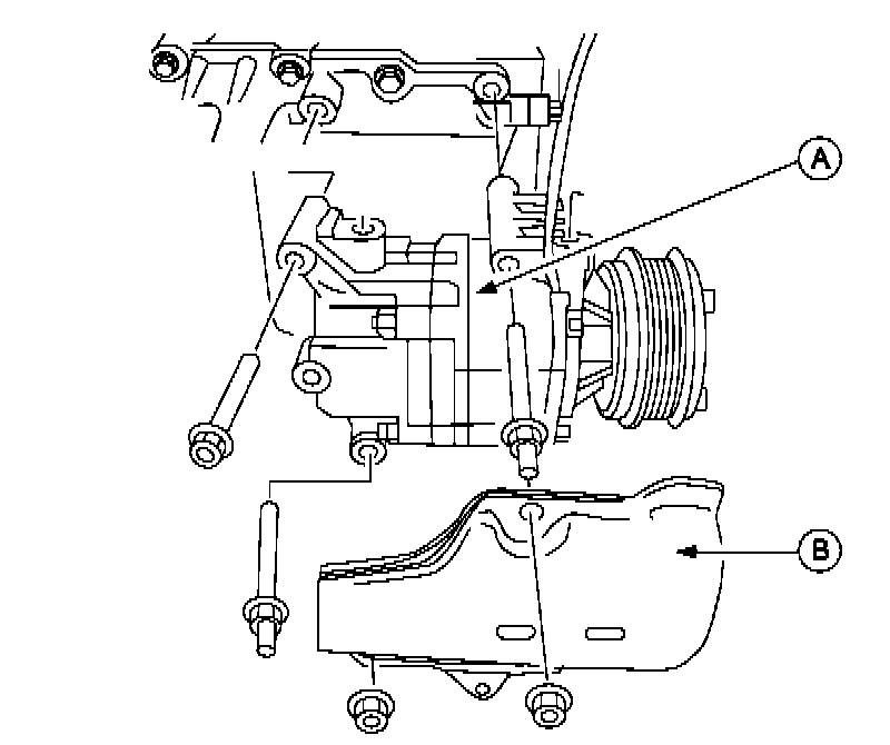 11. Remove the A/C compressor (A) after removing the protector (B).