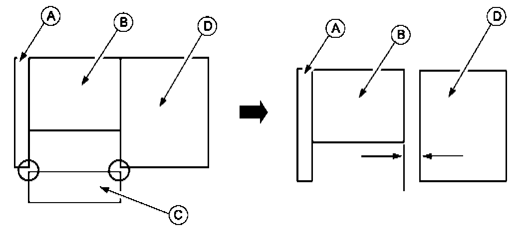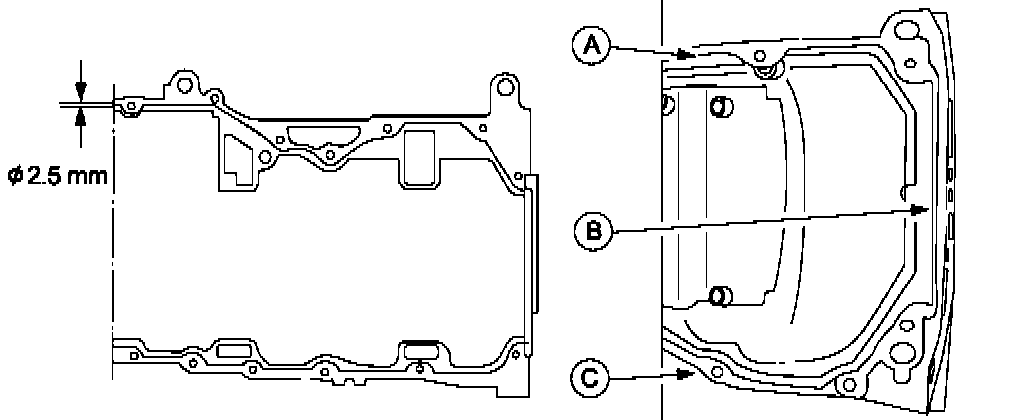 b. Apply a 2.5 mm bead to the rear edge (B) of the oil pan (approximately 5mm from the rear edge).
