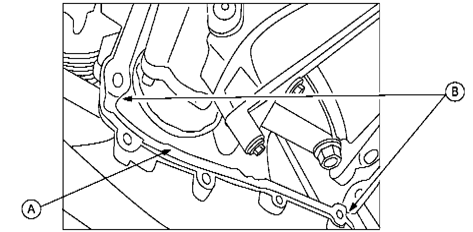 e. Apply an ample amount to the front cover where the oil pan is fitted (A), and also apply an extra amount (a ball of approximately 5 mm in diameter) of liquid gasket to the corners of the front case and the cylinder block (B).