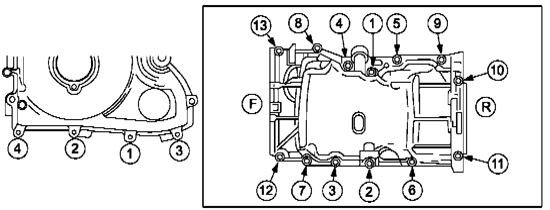 f. Tighten the 13 oil pan bolts to 17.0-23.0 N.m (12.5-17 ft-lb) in the order shown.