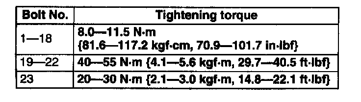 Tightening torque 18 - 22 Nm (1.9 - 2.2 kgf-m, 13.3 - 16.2 ft. lbs.)
