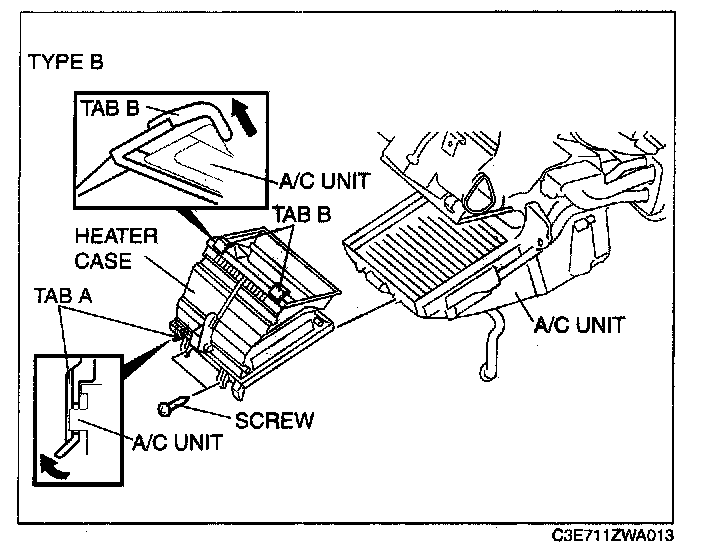 3. Pull up tabs B in the direction shown by the arrow in the figure and remove it from the A/C unit.
