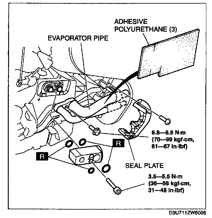 7. Remove the bolt arid shift the evaporator pipe. Do not allow compressor oil to spill.