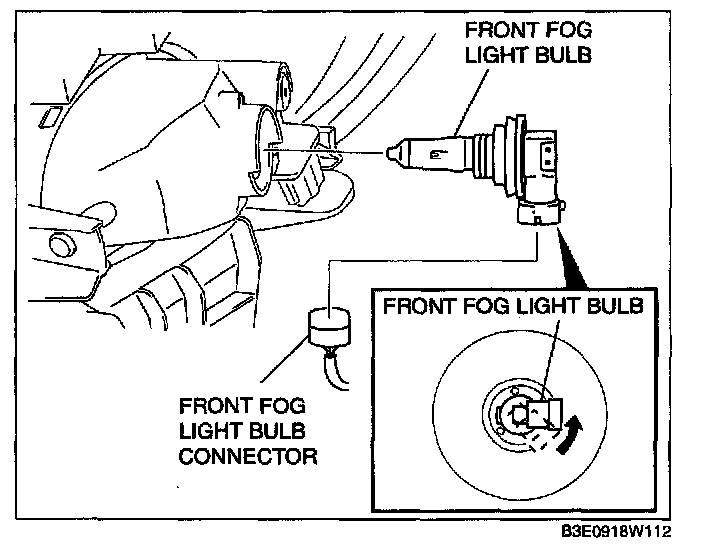 3. Disconnect the front fog light bulb connector and remove the front tog light bulb by turning it in the direction of the arrow.