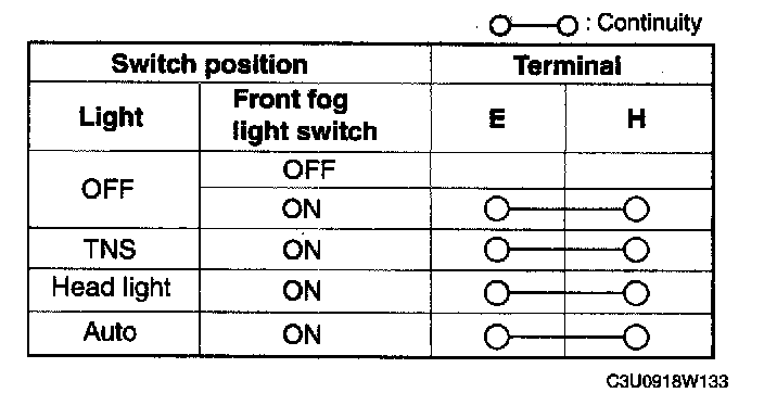 Verify that the continuity between the front fog light switch terminals is as indicated in the table.
