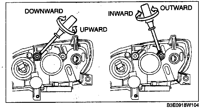 NOTE: If the adjusting screws are tightened first, then loosened, they will continue to loosen when the vehicle is in motion and may cause the headlights to become misaligned. Always turn the screws in the tightening direction.