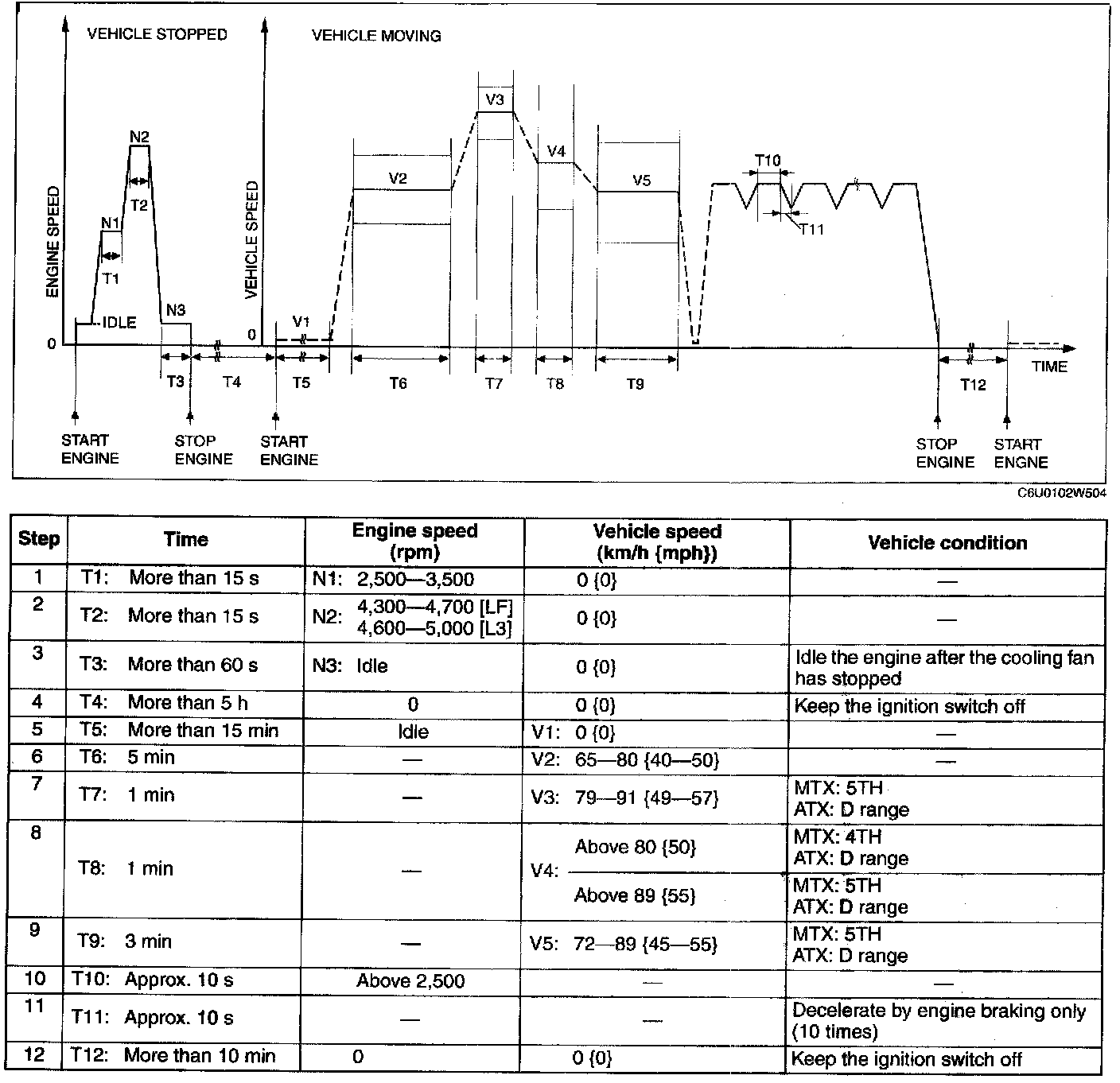 6. Drive the vehicle at an engine speed of 65 - 80 km/h {40 - 50 mph} for more than 5 min.