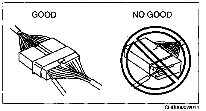 - When a tester is used to inspect for continuity or measuring voltage, insert the tester probe from the wiring harness side.