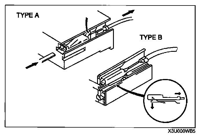 - Insert a thin piece of metal from the terminal side of the connector and with the terminal locking tab pressed down, pull the terminal out from the connector.