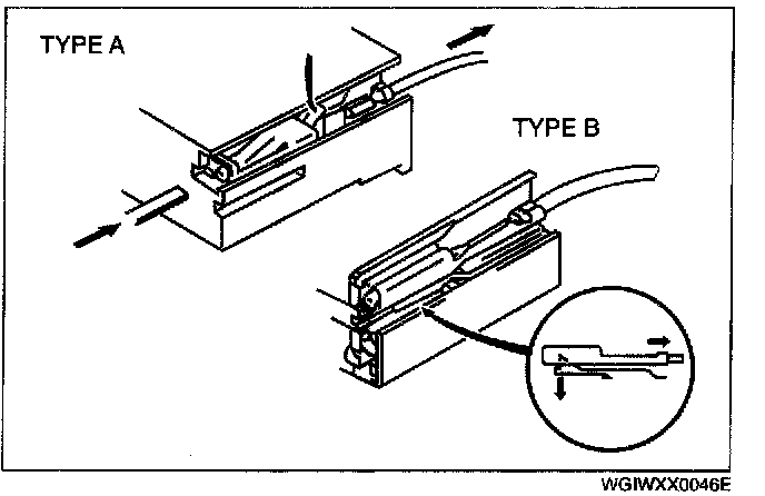 - Insert a thin piece of metal from the terminal side of the connector and with the terminal locking tab pressed down, pull the terminal out from the connector.